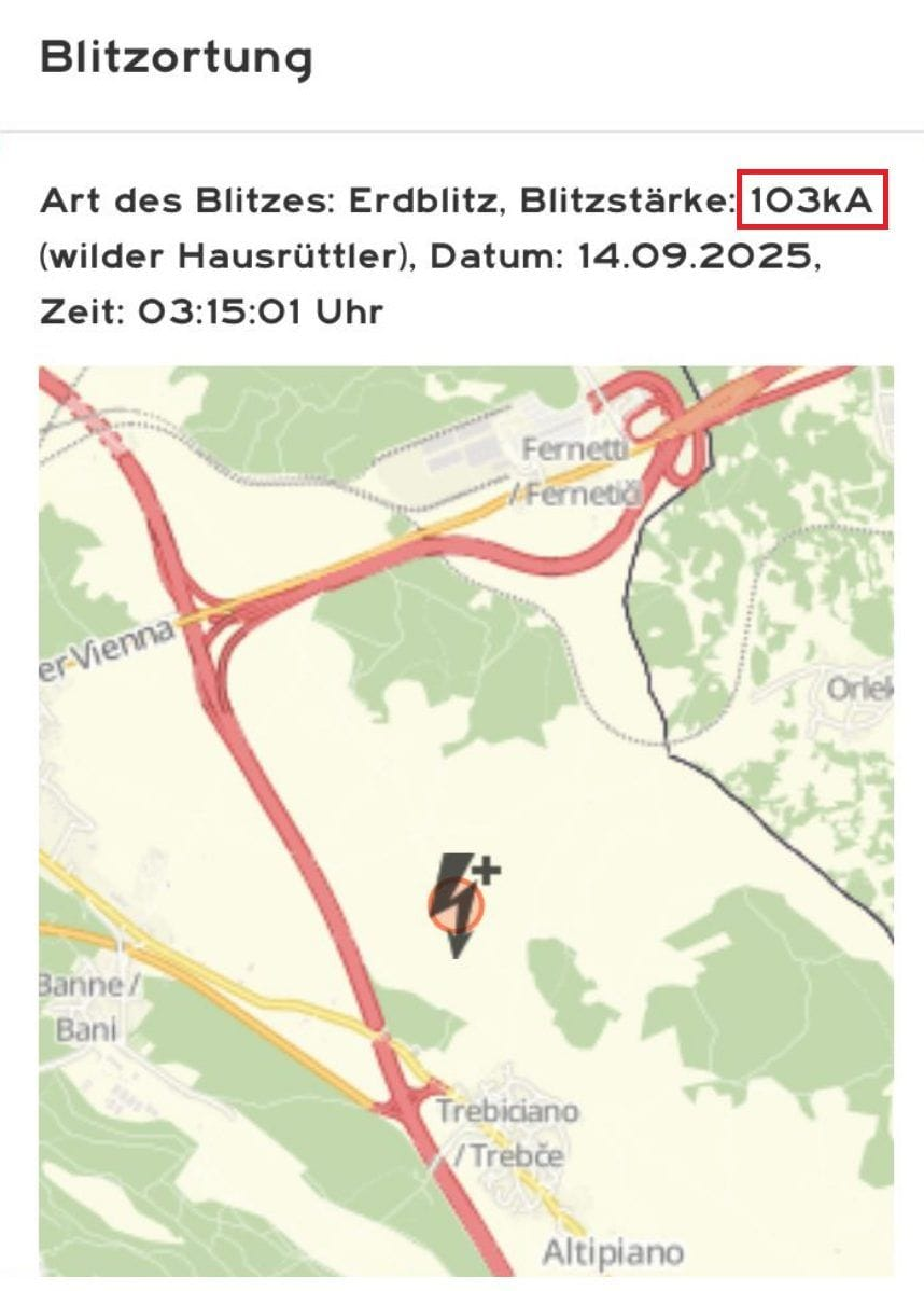 V noci na nedeľu 14. septembra 2025 o 3:15 miestneho času zasiahol okolie dediny Trebiciano (asi 5 km severovýchodne od Terstu) mimoriadne silný pozitívny blesk.