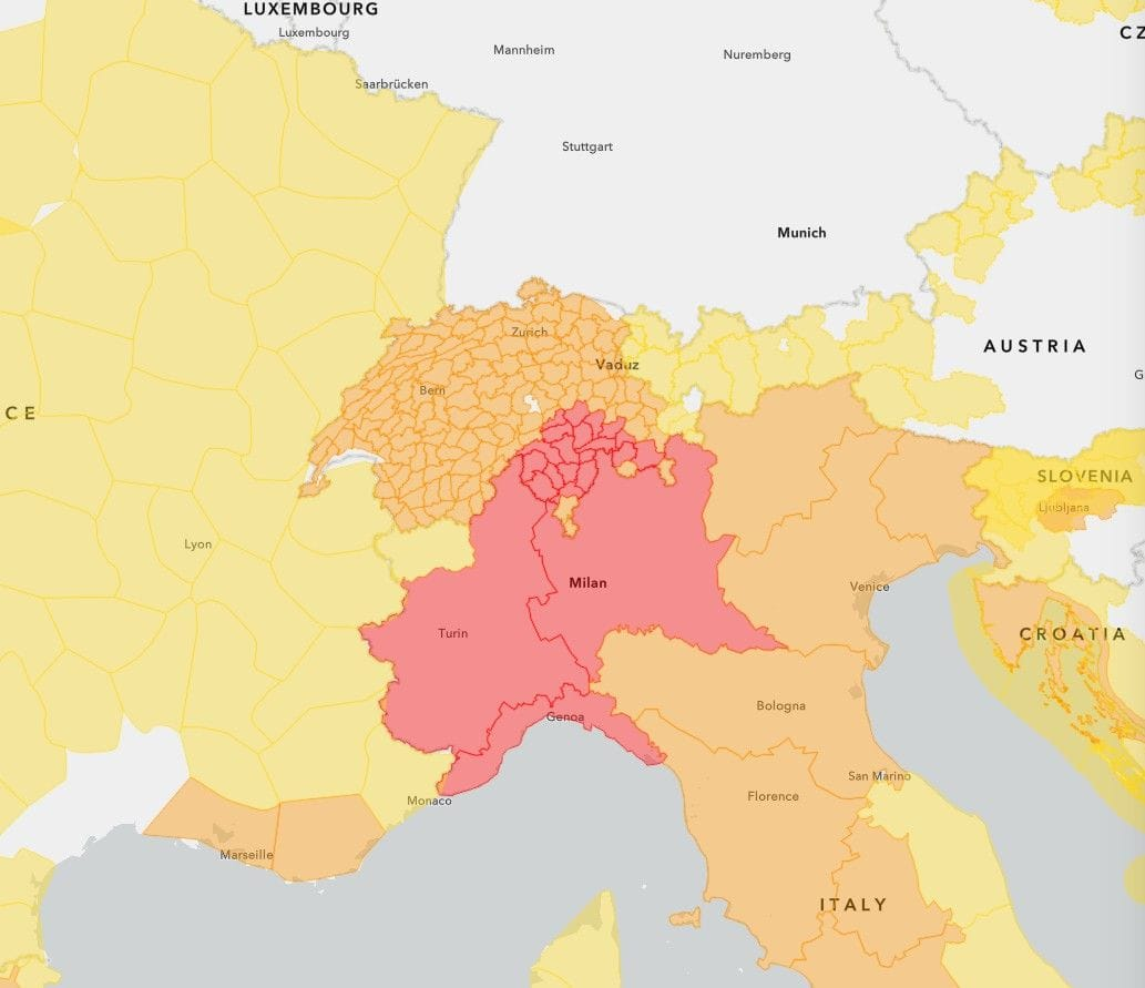 Podobne vážna situácia je aj v Taliansku, kde bola vydaná červená výstraha (3. stupeň) pred intenzívnym dažďom pre regióny Lombardia, Piemont a okolie Janova. Talianske úrady vyzývajú obyvateľov, aby prijali preventívne opatrenia, zostali ostražití a riadili sa pokynmi úradov.
