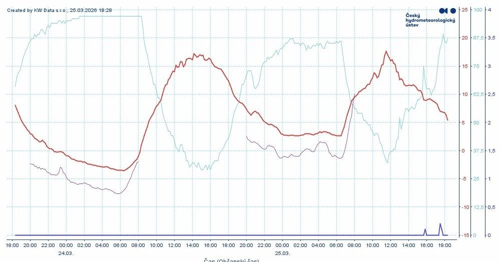Výraznú zmenu počasia dnes zaznamenali aj naši západní susedia v Českej republike. Podľa informácií Českého hydrometeorologického ústavu sa v Plzeňskom a Karlovarskom kraji počas dnešného dňa naplno prejavila dlho avizovaná zmena charakteru počasia. Od severozápadu tam postupoval výrazný studený front, ktorý počas popoludnia priniesol zrážky na väčšinu územia. S príchodom studeného vzduchu dochádzalo k postupnému poklesu hranice sneženia, ktorá sa dostala až do stredných a nižších polôh.