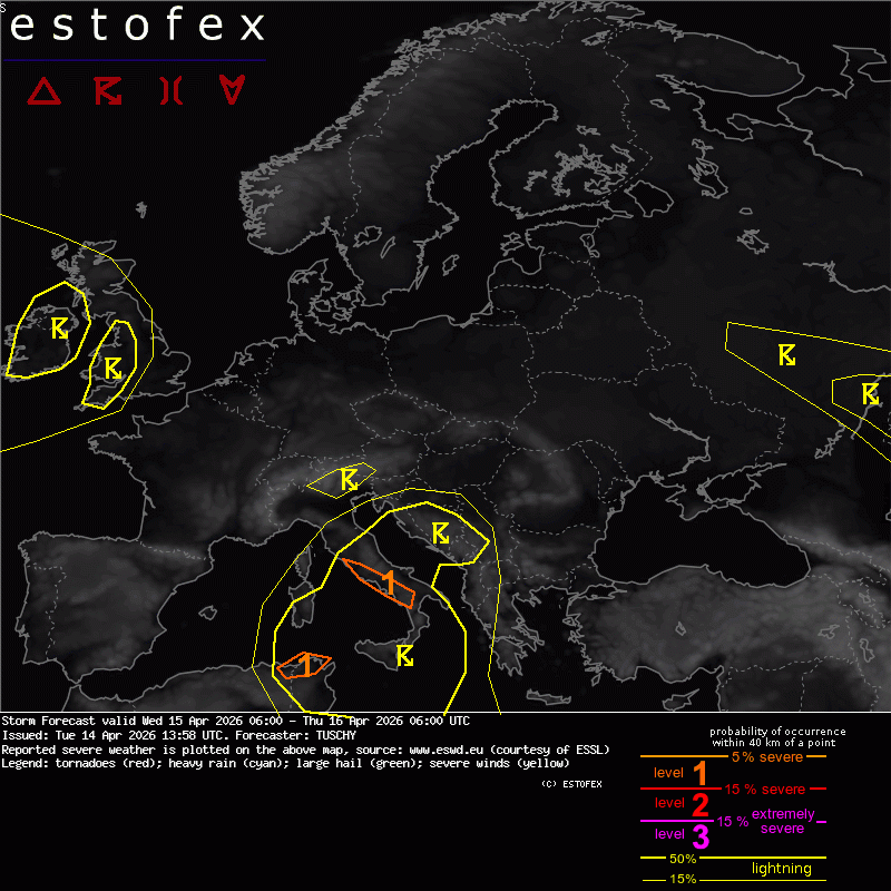 Búrlivá situácia bude pretrvávať až do neskorých večerných hodín, kedy sa zrážkové polia presunú ďalej na juhovýchod nad Toskánsko, Umbriu a Marche, kde však už budú javy v dôsledku klesajúcej instability strácať na intenzite.
