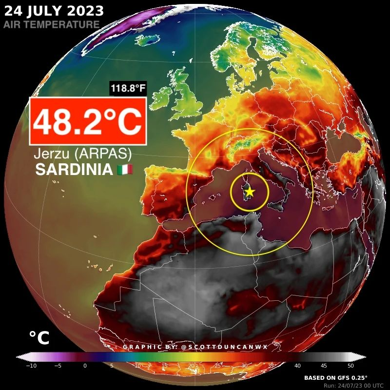 Celkovo počas pondelka v Taliansku padlo spolu až 8 teplotných rekordov. Teplotou +48,2 °C v Jerzu a Lotzorai na Sardínii nielenže ostrov vyrovnal svoje teplotné rekordy zaznamenané v rokoch 1965 v Macomer a 2009 v Perfugas a Santa Maria Coghinas, ale bol stanovený aj nový teplotný rekord pre mesiac júl v Európe.