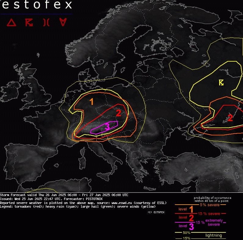 Už teraz sa však začínajú v našej oblasti tvoriť prvé búrky a to predovšetkým nad Rakúskom, kde sa dnes očakávajú nebezpečné búrky s veľkými krúpami. U nás to nebude o veľkých krúpach, ale o veternej smršti. Situácia je pomerne vážna, čo naznačuje aj predpoveď meteorologickej služby Estofex, ktorá vydala najvyšší 3. stupeň.