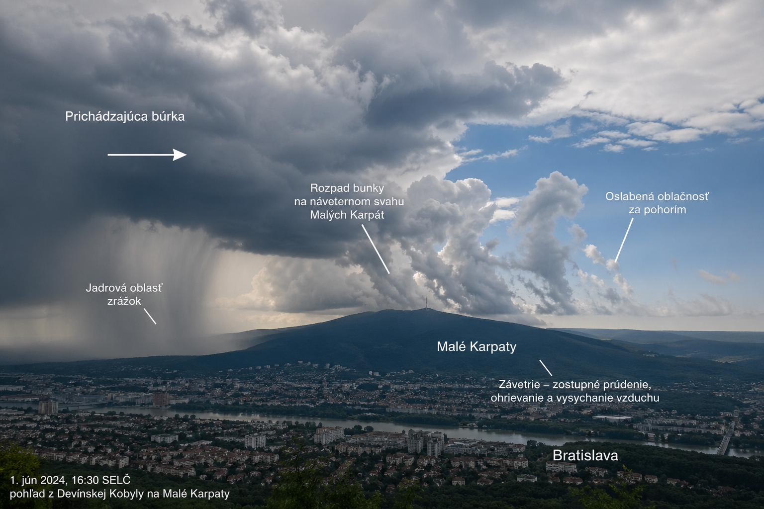 Na náveternej strane pohoria môže vzduch stúpať, čo niekedy búrky dokonca podporí. Problém však nastáva za pohorím, teda na záveternej strane smerom k Bratislave, Pezinku, Sencu či Podunajskej nížine. Tam môže vzduch klesať, mierne sa ohrievať a vysušovať. Takéto prostredie už nie je pre búrku také priaznivé.