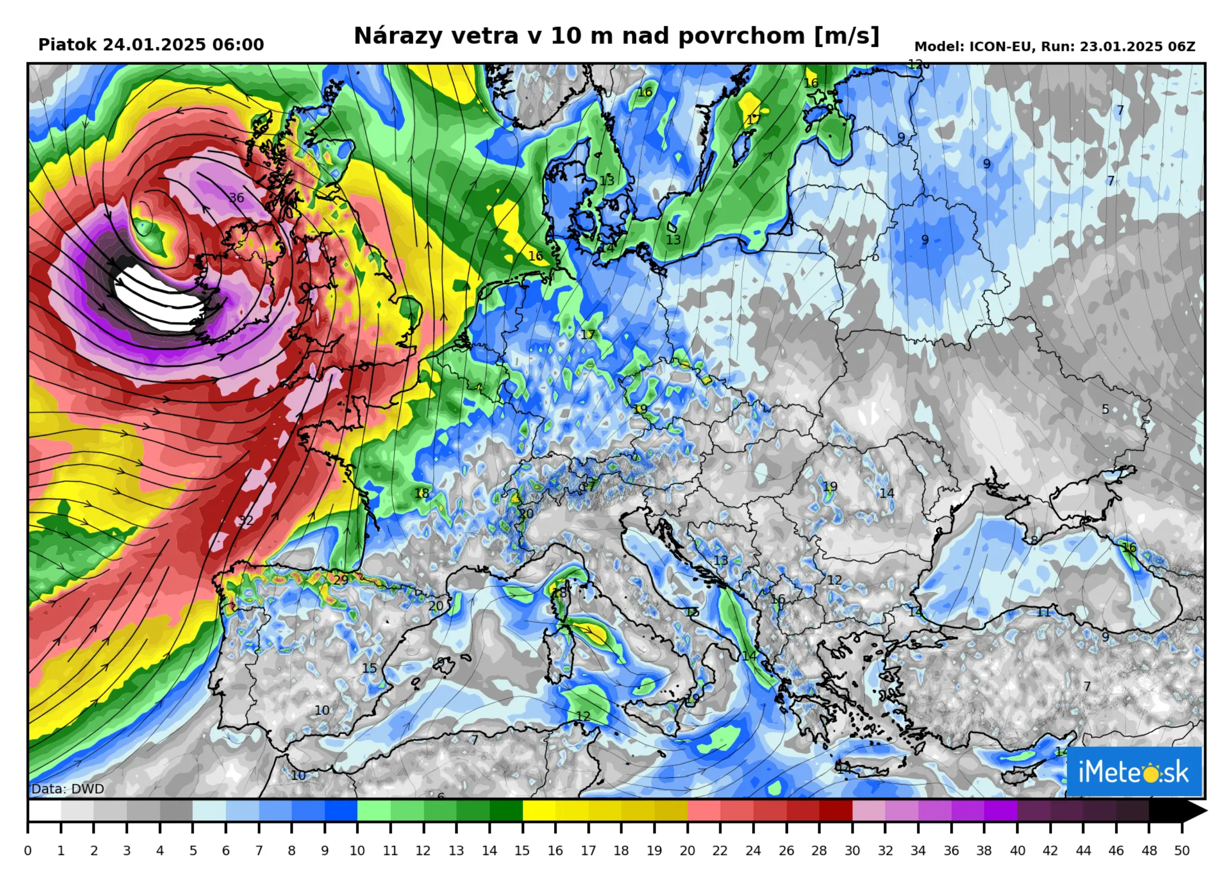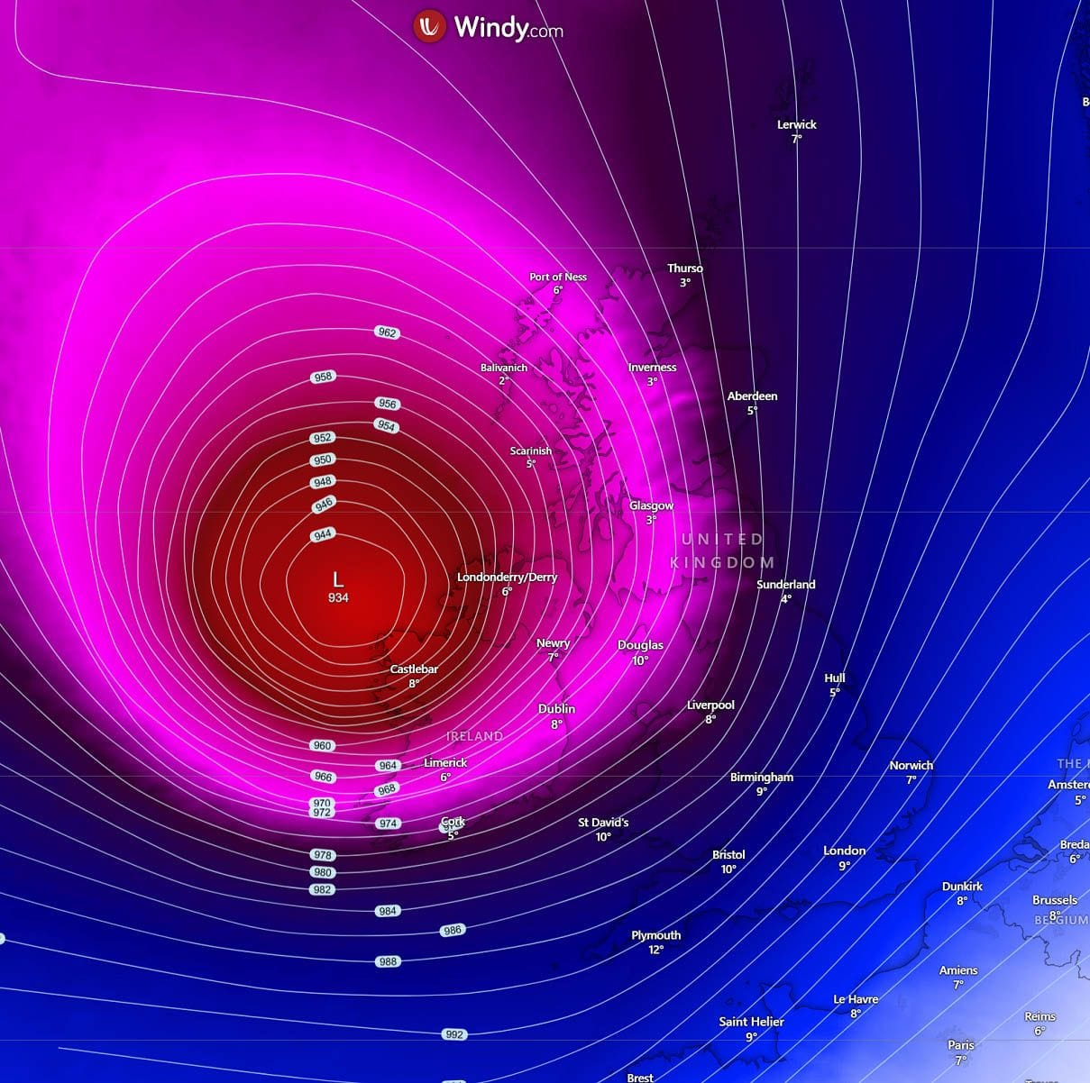 V noci zo štvrtka na piatok sa Éowyn bude rýchlo pohybovať cez severný Atlantik, pričom bude rýchlo zosilňovať. Tlak v strede cyklóny klesne za 24 hodín o takmer 50 hPa, čím bombogenéza vygeneruje extrémne vetry so silou hurikánu.