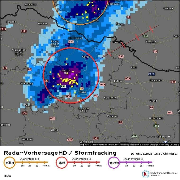 Supercela sa pohybuje severne od Hornu smerom na severovýchod, prináša silný dážď, nárazový vietor a krúpy do 4 cm, ktoré už narobili škodu záhradkárom aj v obci Friedersbach.