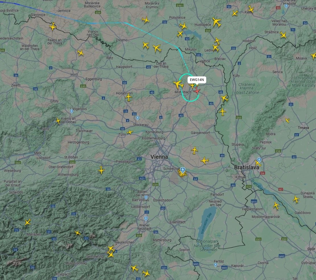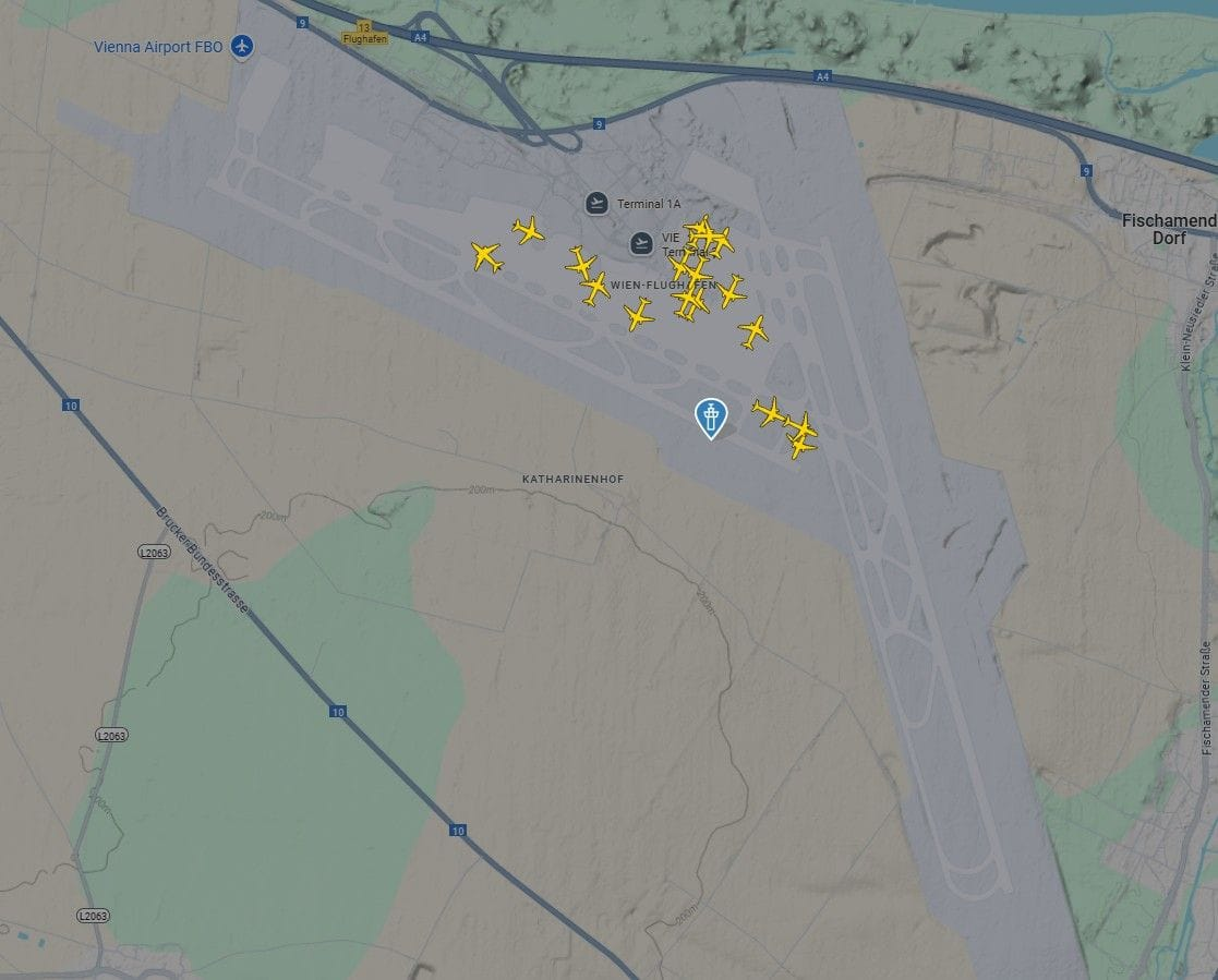 Aktualizované o 18:47: Letisko k 18:41 prerušilo aj pristávanie pre silné turbulencie a veľké riziko. Posledným letom, ktorý pristál je let FR012 spoločnosti Ryanair z Barcelony. Lietadlá aktuálne vyčkávajú severne od Viedne vo vyčkávacom obrazci.