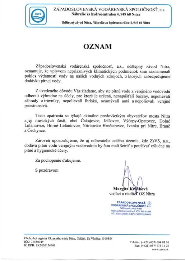 Západoslovenská vodárenská spoločnosť (ZsVS, a.s.) odštepný závod Nitra, zaznamenala pokles výdatnosti vody na vodných zdrojoch, z ktorých zabezpečuje dodávky pitnej vody, v dôsledku nepriaznivých klimatických podmienok.