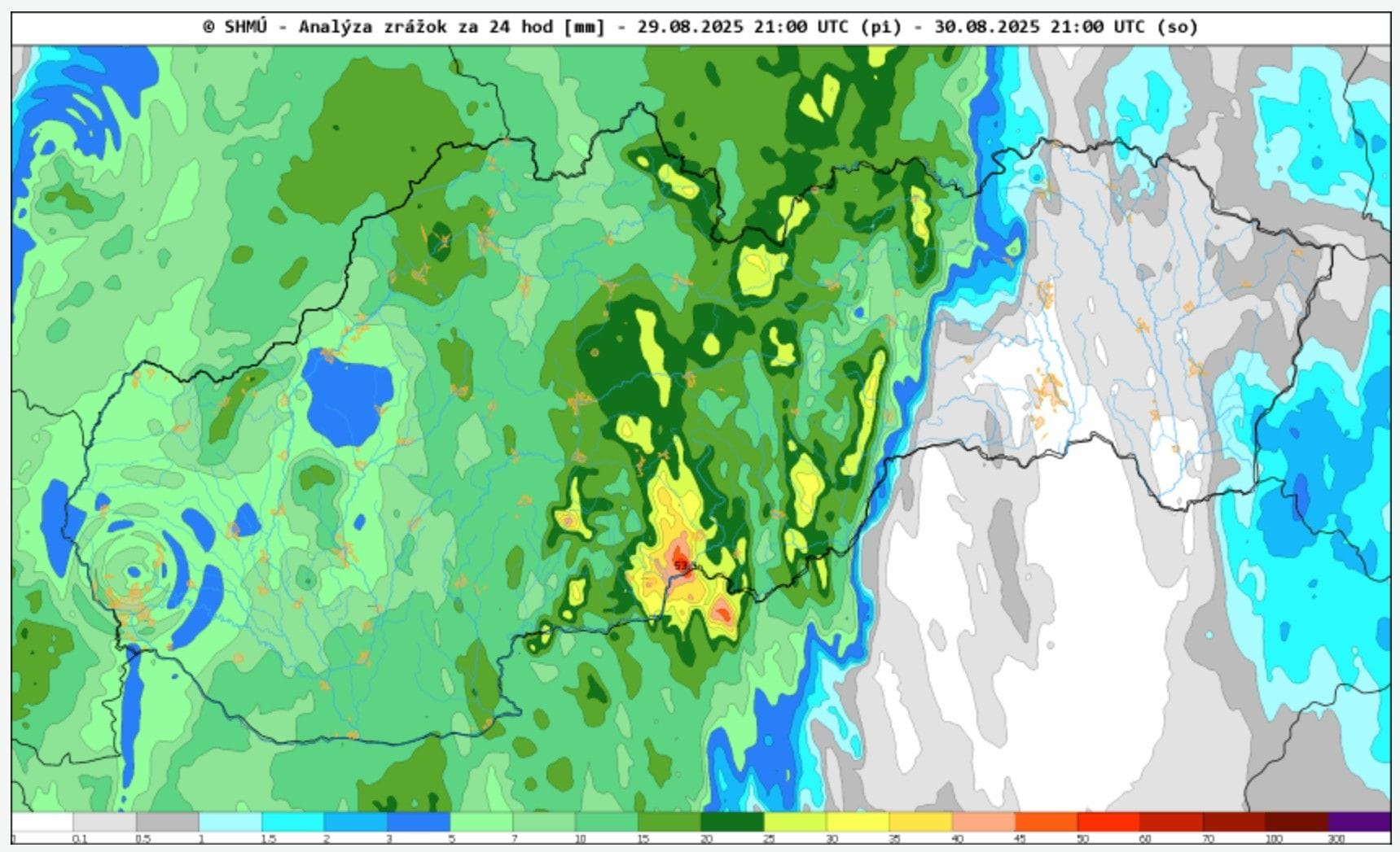 Najvýdatnejšie zrážky sa zatiaľ vyskytli v oblasti stredného Slovenska. Najviac spadlo na juhu a na Orave, kde spadlo od 25 do 45 mm. Tieto zrážky tu priniesli zrážky spolu s búrkami.