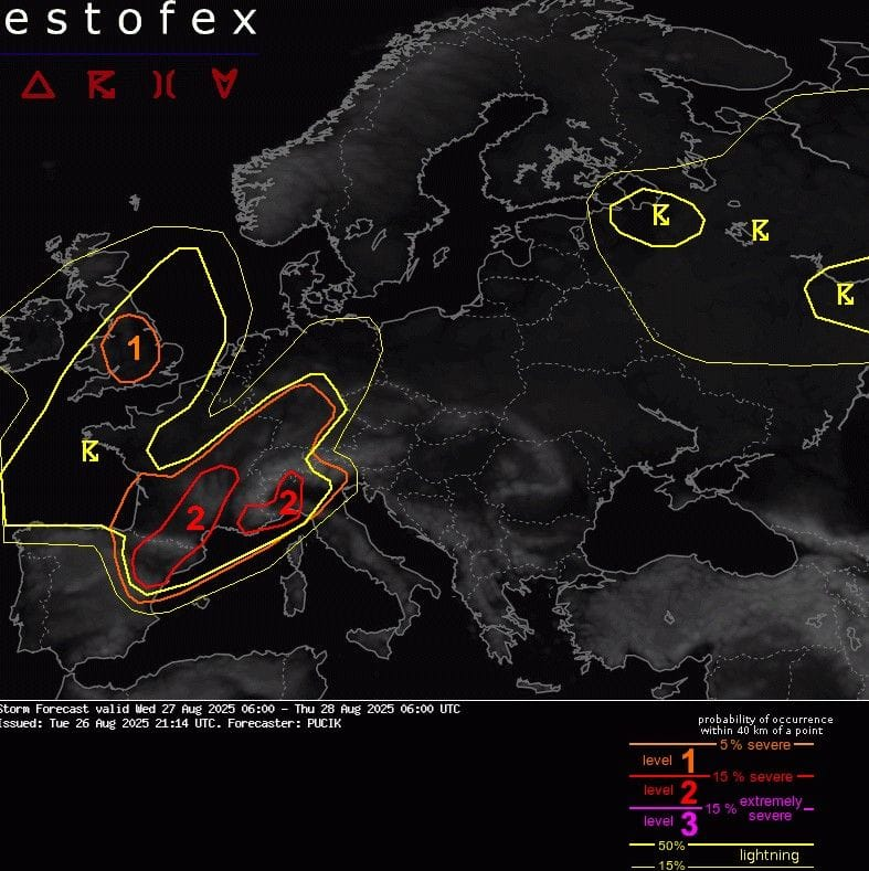 Európske centrum pre predpoveď nebezpečných búrok ESTOFEX vydalo pre dnešný deň (streda 27. 8. 2025) a nasledujúcu noc výstrahy pred búrkami, pričom najvyššiu pozornosť upriamuje na oblasť od severného Španielska až po centrálnu časť Francúzska.
