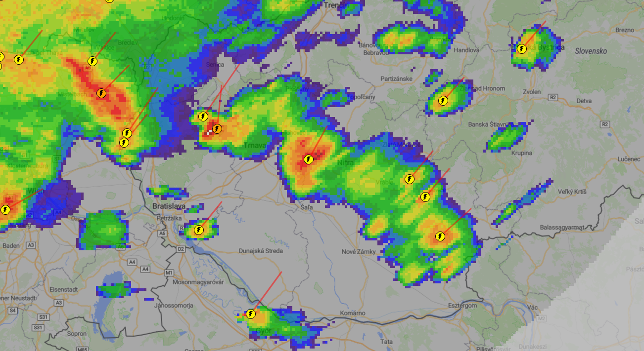 Aktuálne máme na našom území dve významnejšie búrkové systémy. Jeden postupuje z Rakúska nad Záhorie a je aktuálne najnebezpečnejší a druhé búrky putujú Podunajskou nížinou.