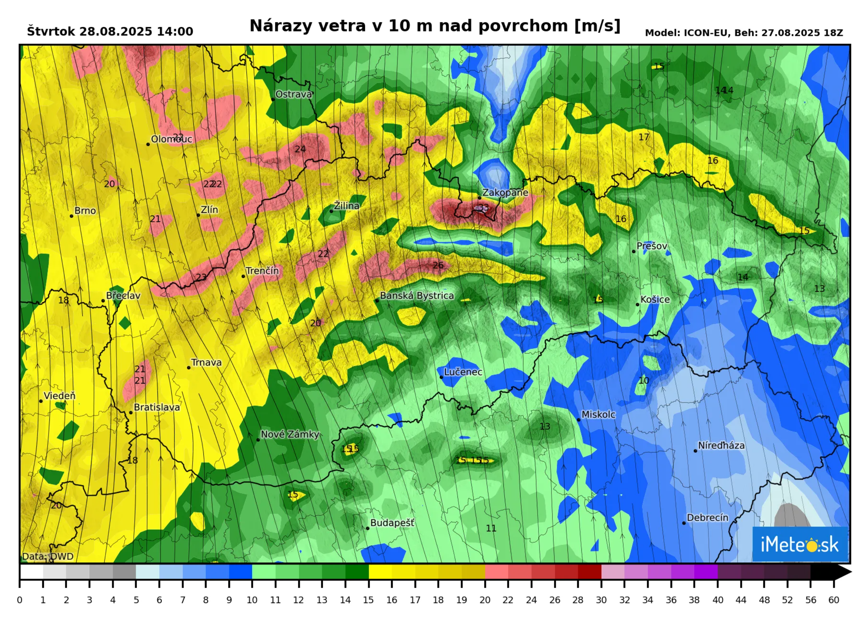 Vietor dnes bude dosahovať rýchlosť 4 až 12 m/s, v nárazoch lokálne 15 až 20 m/s (15 až 45, 55 až 70 km/h).