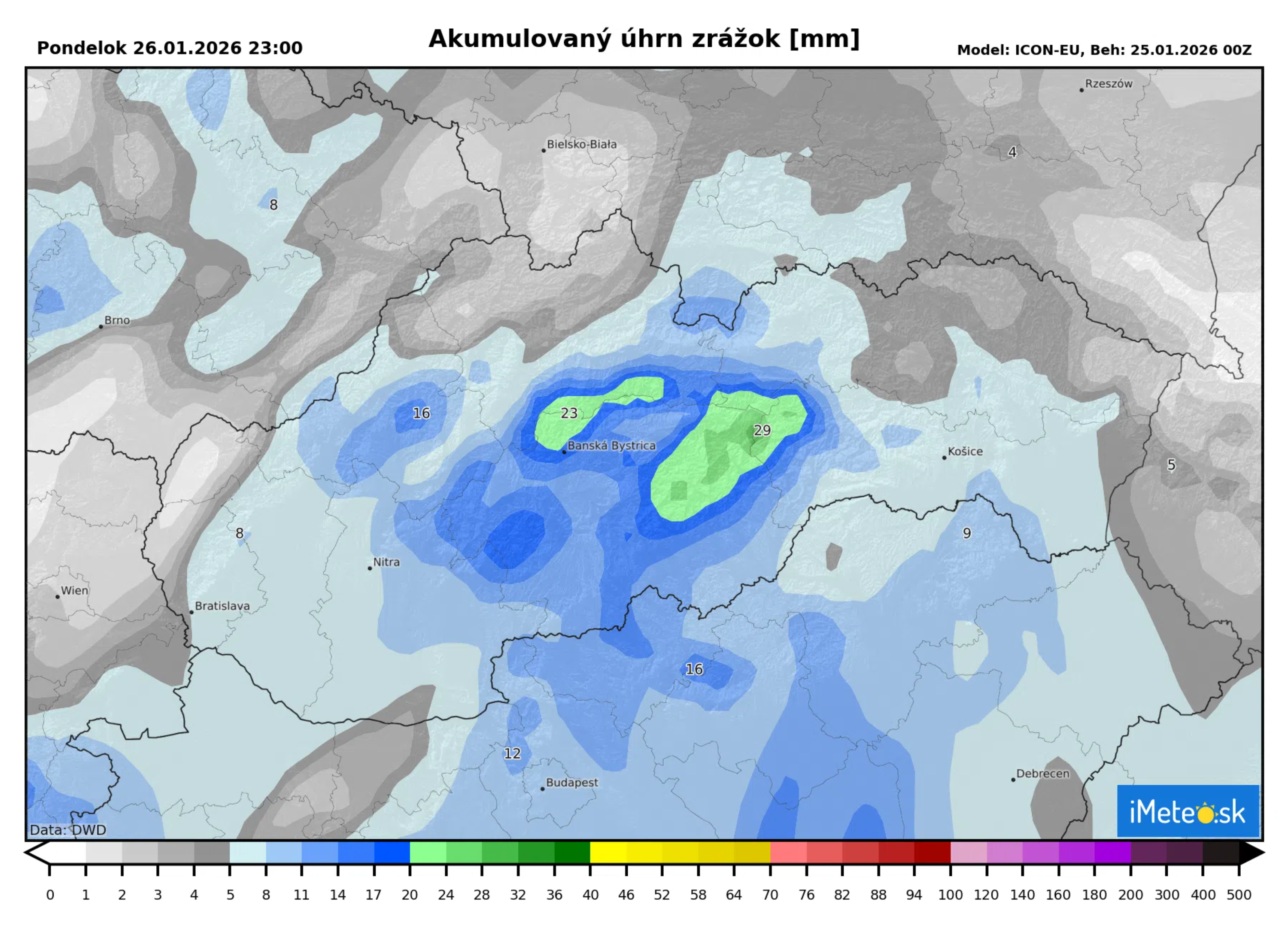Zrážky začnú dnes popoludní prichádzať od západu a postupovať ďalej na východ. Najintenzívnejší dážď však v najbližších hodinách očakávame na strednom Slovensku, kde môže do zajtrajšieho večera pribudnúť 30 mm zrážok, lokálne aj viac.