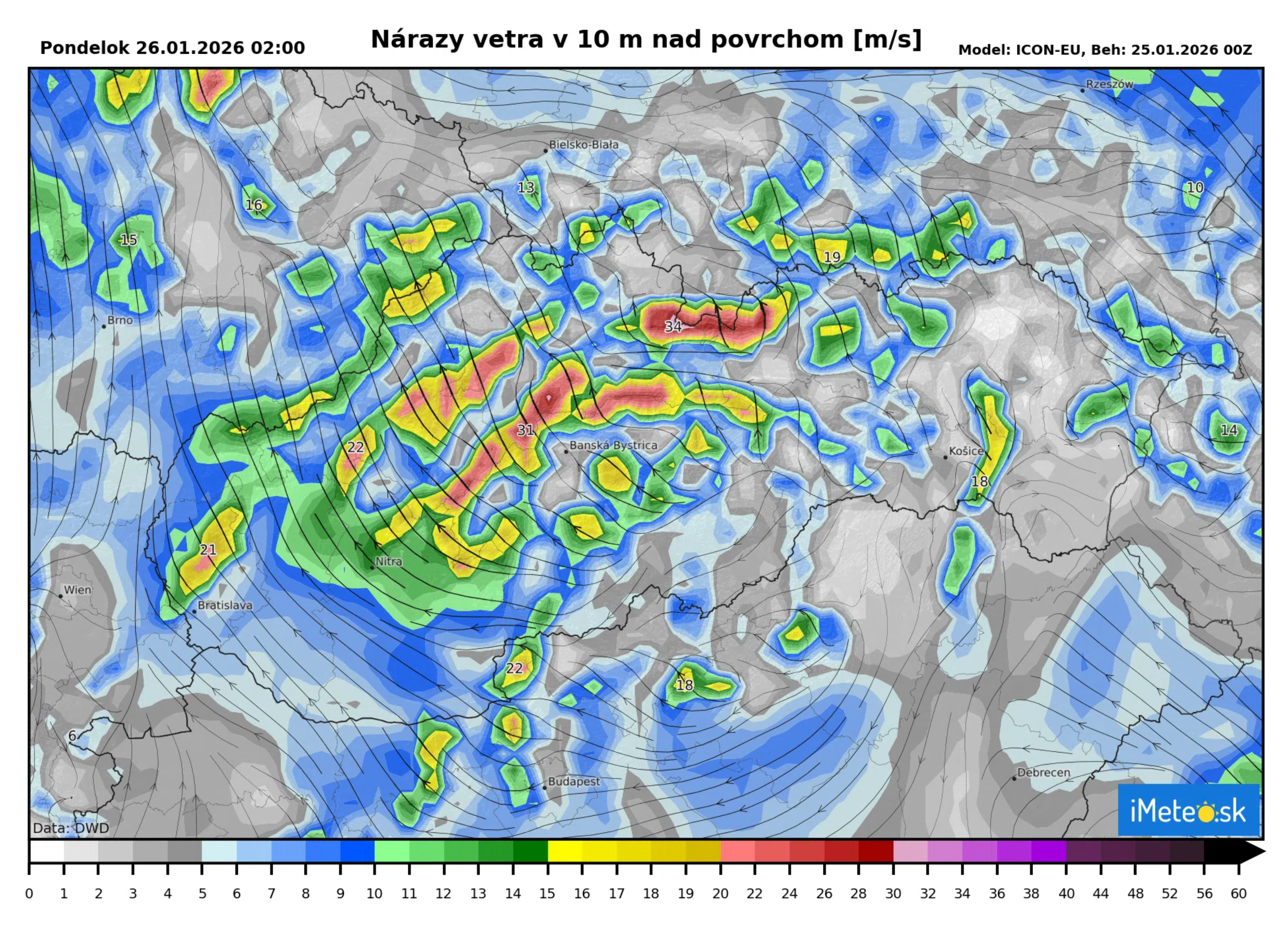 Očakáva sa výskyt vetra, ktorý môže v nárazoch dosahovať rýchlosť 15 až 23 m/s (vyše 70 km/h).