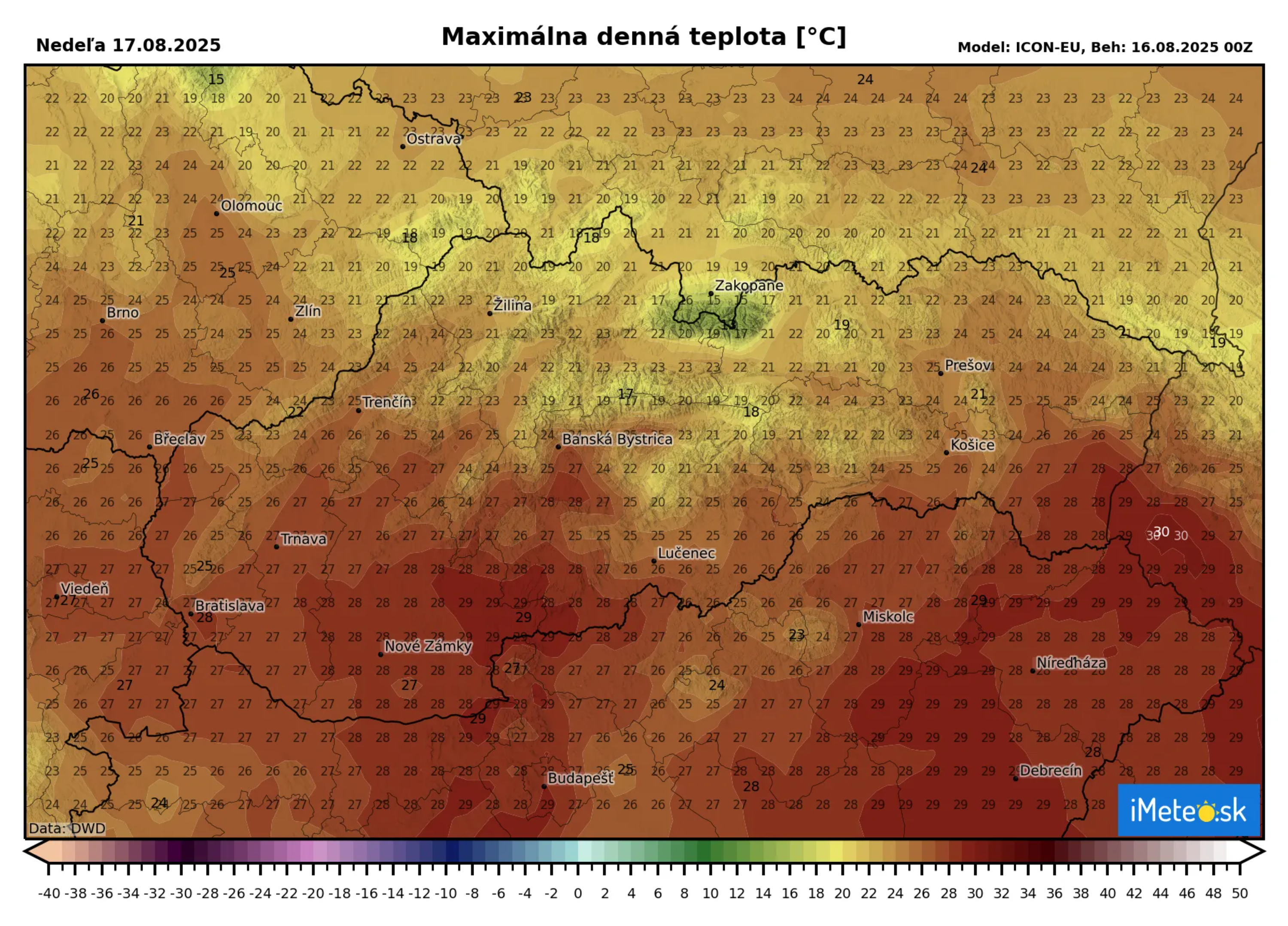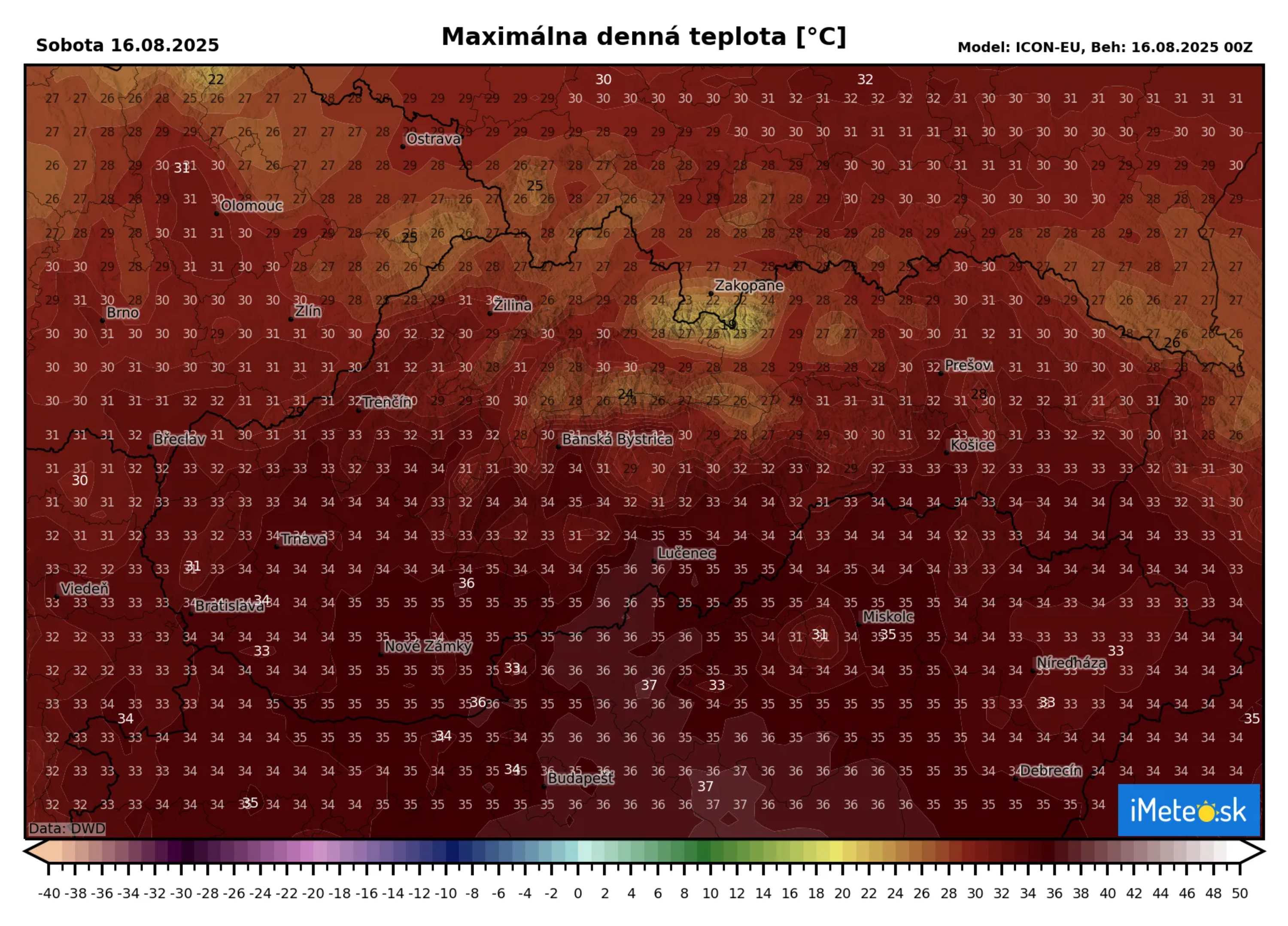 Zatiaľ čo v okresoch s prvým stupňom varovania môžu teploty vystúpiť k +34 °C, v najjužnejších okresoch s druhým stupňom varovania to môže byť až +36 °C, lokálne aj viac.