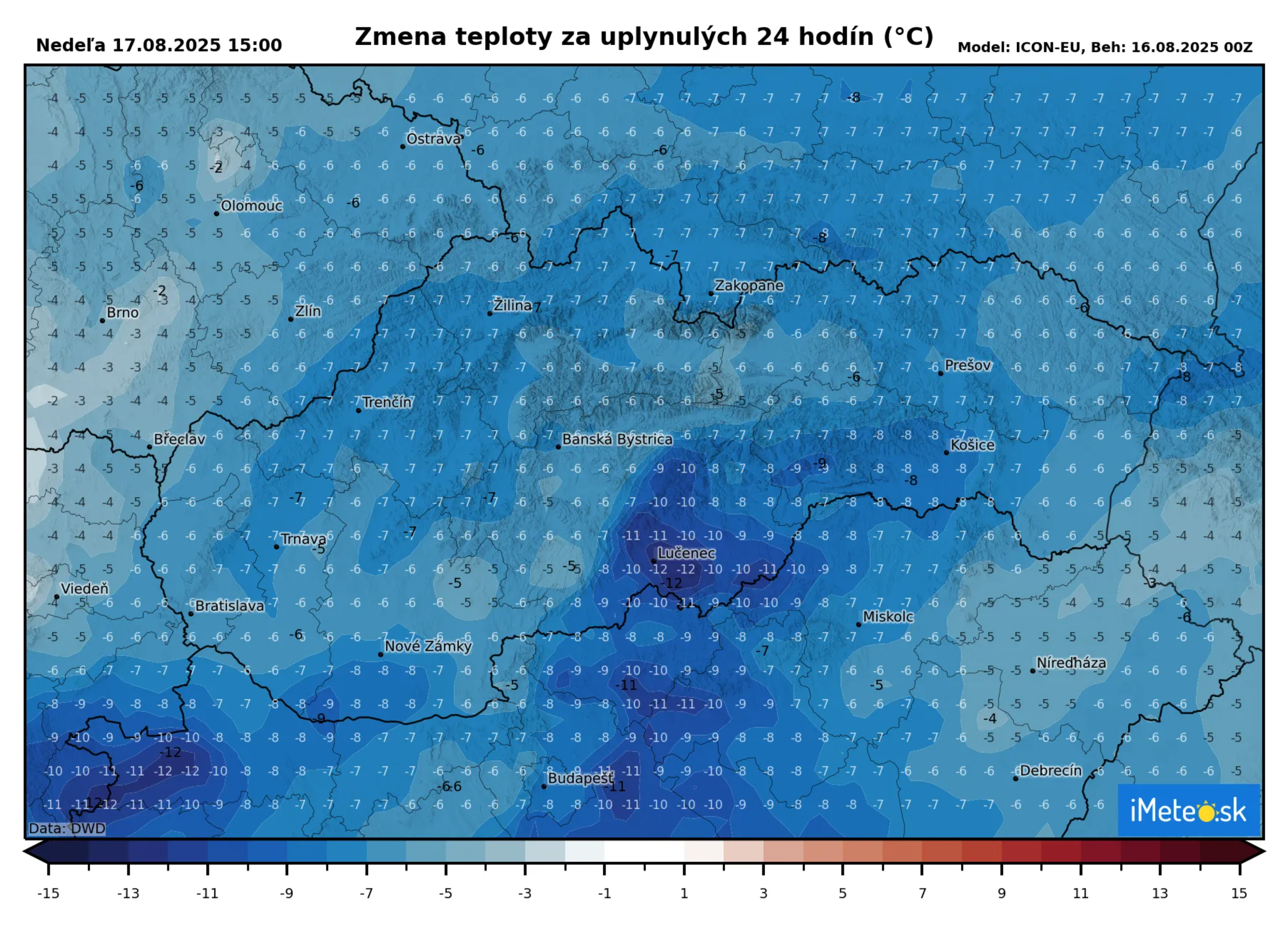 Zmena teploty v priebehu 24 hodín tak niekde bude predstavovať 10 až 12 °C.