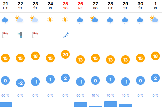 Ku koncu týždňa sa mierne oteplí a teploty by sa mohli dostať až k hranici +20 °C, čo však bude stále pod úrovňou dlhodobého normálu.