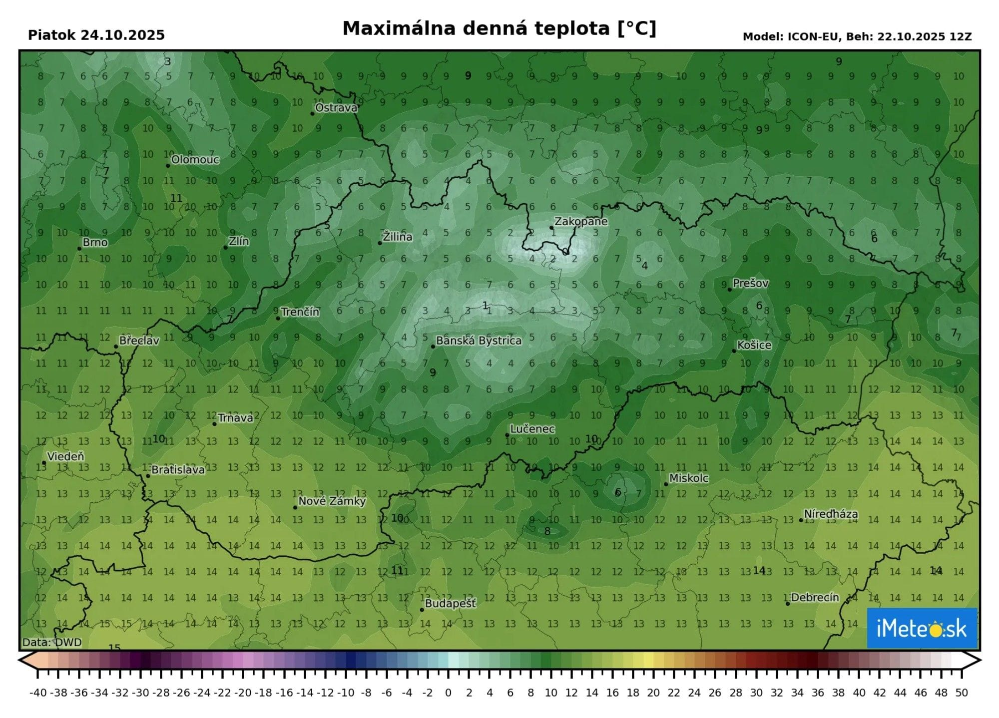 Samozrejme +23 °C nebude všade a teploty sa nad hranicu +20 °C dostanú len na západe. Maximálne hodnoty čakajte v južných regiónoch, v okolí Komárna, či Dunajskej Stredy.