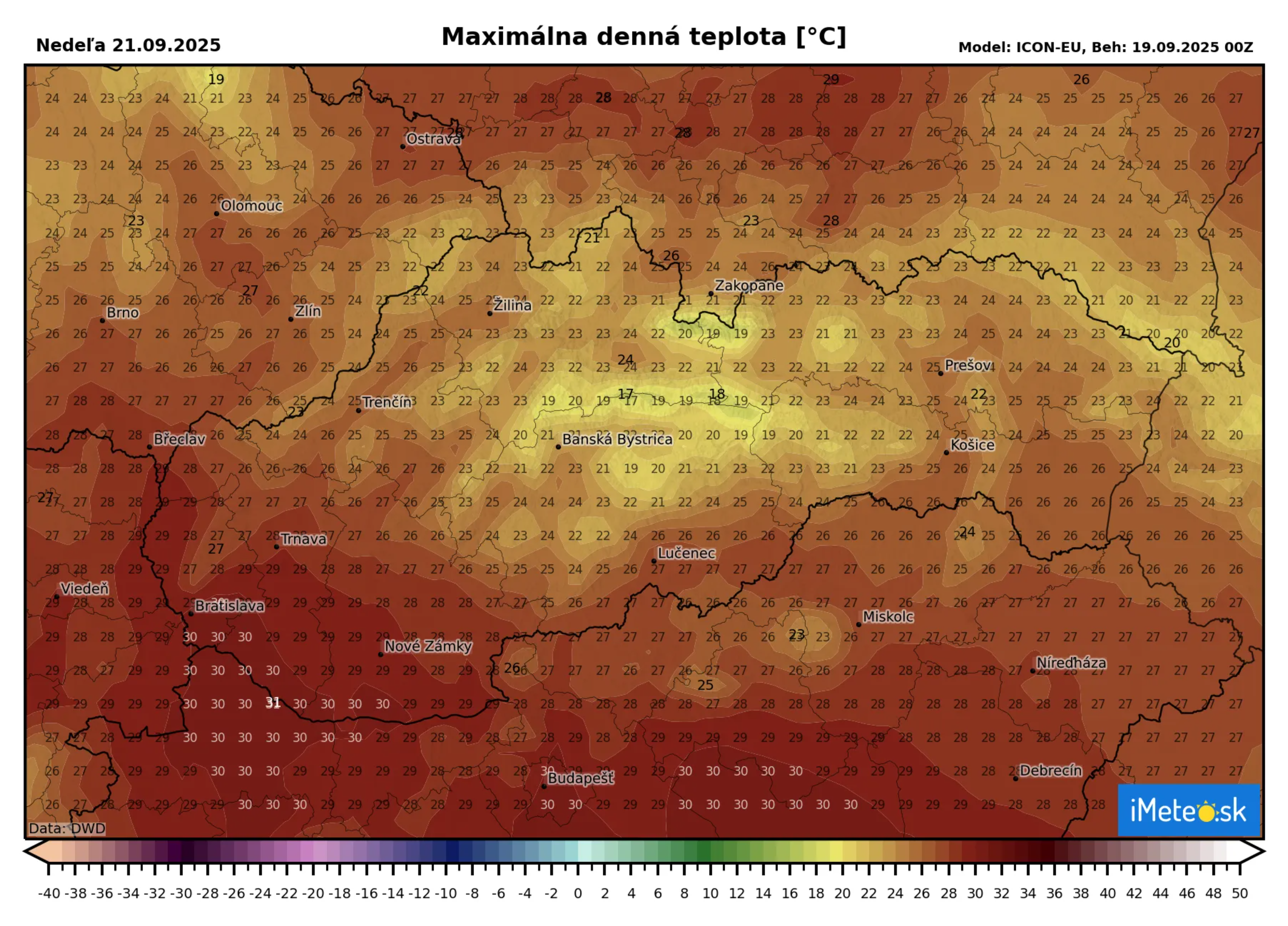 V nedeľu teploty s najväčšou pravdepodobnosťou prekročia hranicu tropického dňa (+30 °C) a v najteplejších oblastiach Slovenska môžu dosiahnuť až +31 °C.