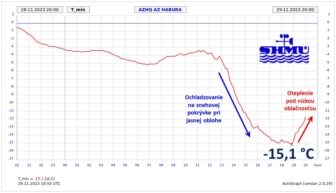 Teplota na snehovej pokrývke a pri jasnej oblohe veľmi rýchlo klesá. To sa stalo aj včera v obci Habura a tak klesla až na -15,1 °C. Treba ale povedať, že išlo o krátkodobý jav a vplyvom oblačnosti teplota potom znova vystúpila.
