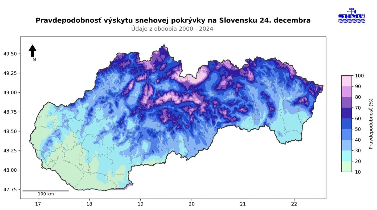 SHMÚ informuje o klesajúcom trende bielych Vianoc na Slovensku. Napríklad v Bratislave na Kolibe bola pravdepodobnosť výskytu snehovej pokrývky na Štedrý deň ráno v období 1951 – 2024 až 43 %. Po roku 2000 však výrazne klesla na 36 % a v poslednom desaťročí (2015 – 2024) už dosahuje len 20 %. Podobný vývoj vidno aj na bratislavskom letisku, kde sa šanca na sneh znížila z 31 % v dlhodobom priemere na 20 % v posledných rokoch.
