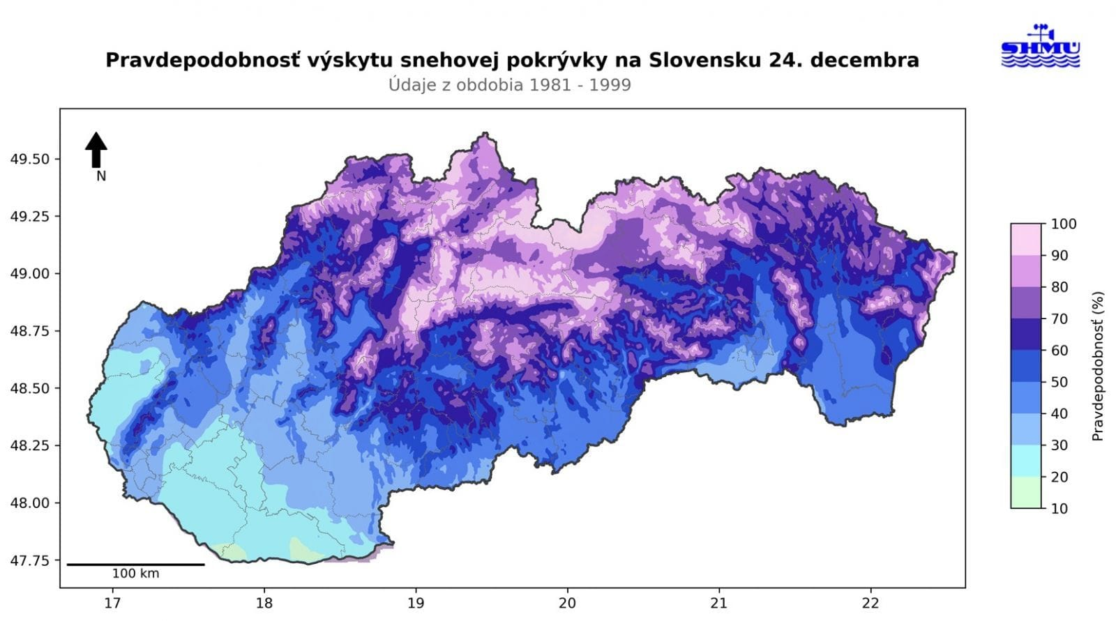 Úbytok snehu sa však nevyhýba ani kotlinám stredného Slovenska, ktoré boli tradične považované za snehovo spoľahlivejšie oblasti. V Poprade bola pravdepodobnosť snehovej pokrývky na Štedrý deň ráno v období 1951 – 2024 až 62 %. V období 2000 – 2024 klesla na 56 % a v rokoch 2015 – 2024 už len na 40 %, čo predstavuje výrazný pokles aj v tejto chladnejšej oblasti.