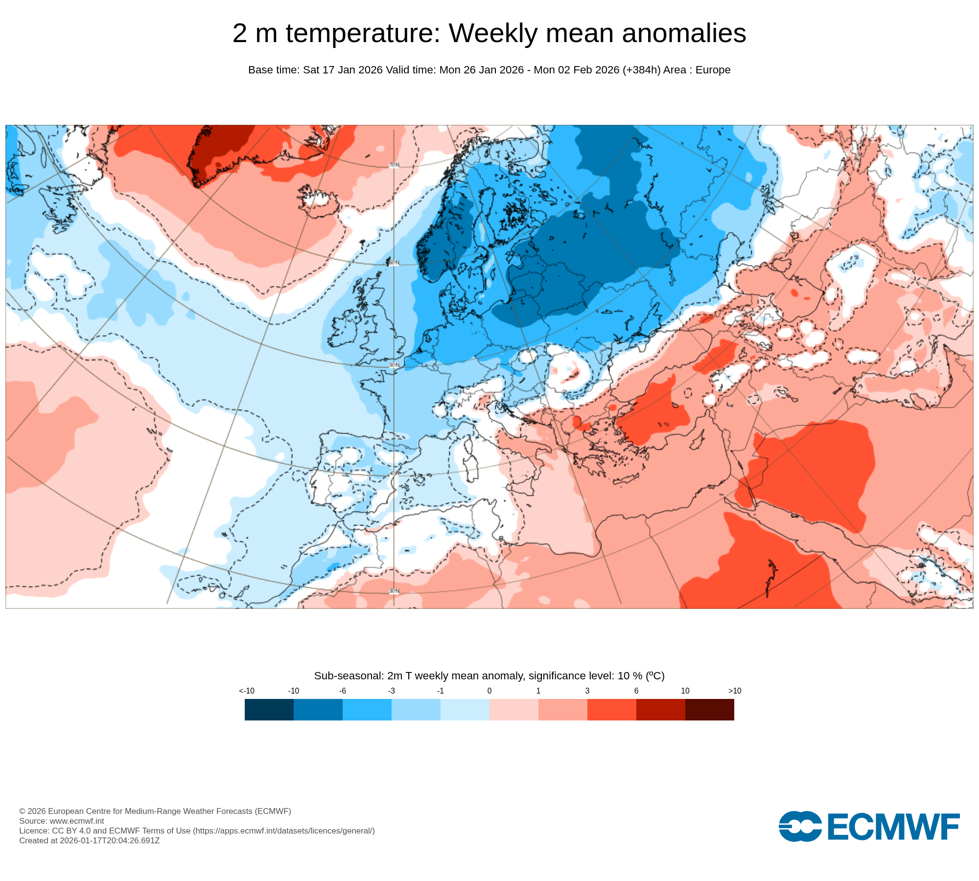 Priemerná teplota by sa mala v našej oblasti pohybovať o 3 až 6 °C pod hranicou dlhodobého normálu, pričom vo východnej Európe a v Škandinávii môže byť dokonca až o 10 °C nižšia, než je na január bežné.