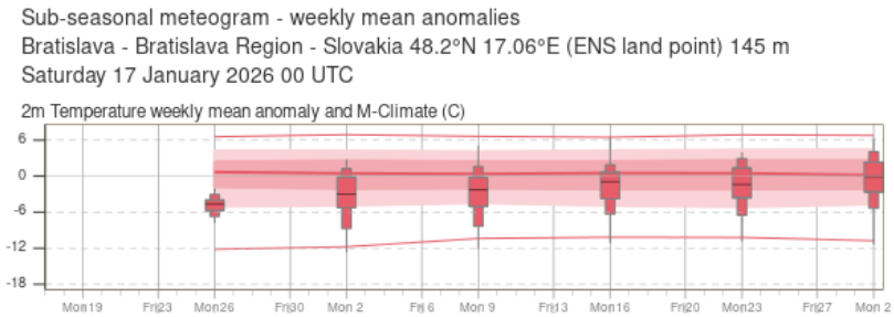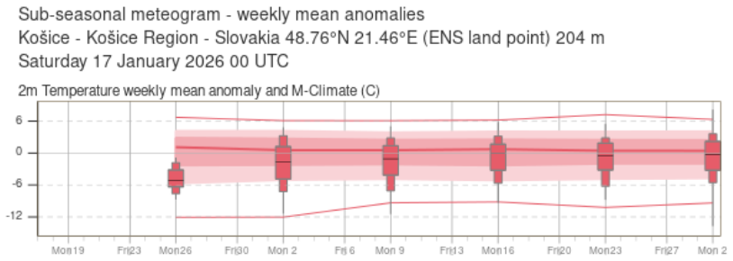 Z grafov vyplýva, že existuje vysoká pravdepodobnosť, že priemerná teplota až do začiatku marca zostane pod úrovňou dlhodobého teplotného normálu. V konkrétnych číslach by mala byť priemerná teplota v nasledujúcich týždňoch o 1 až 3 °C nižšia, než je pre toto obdobie bežné.