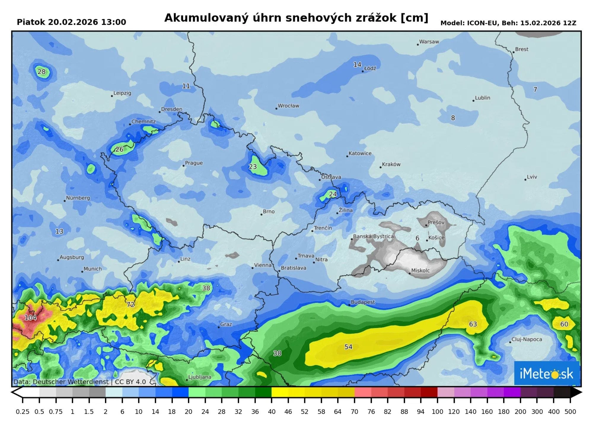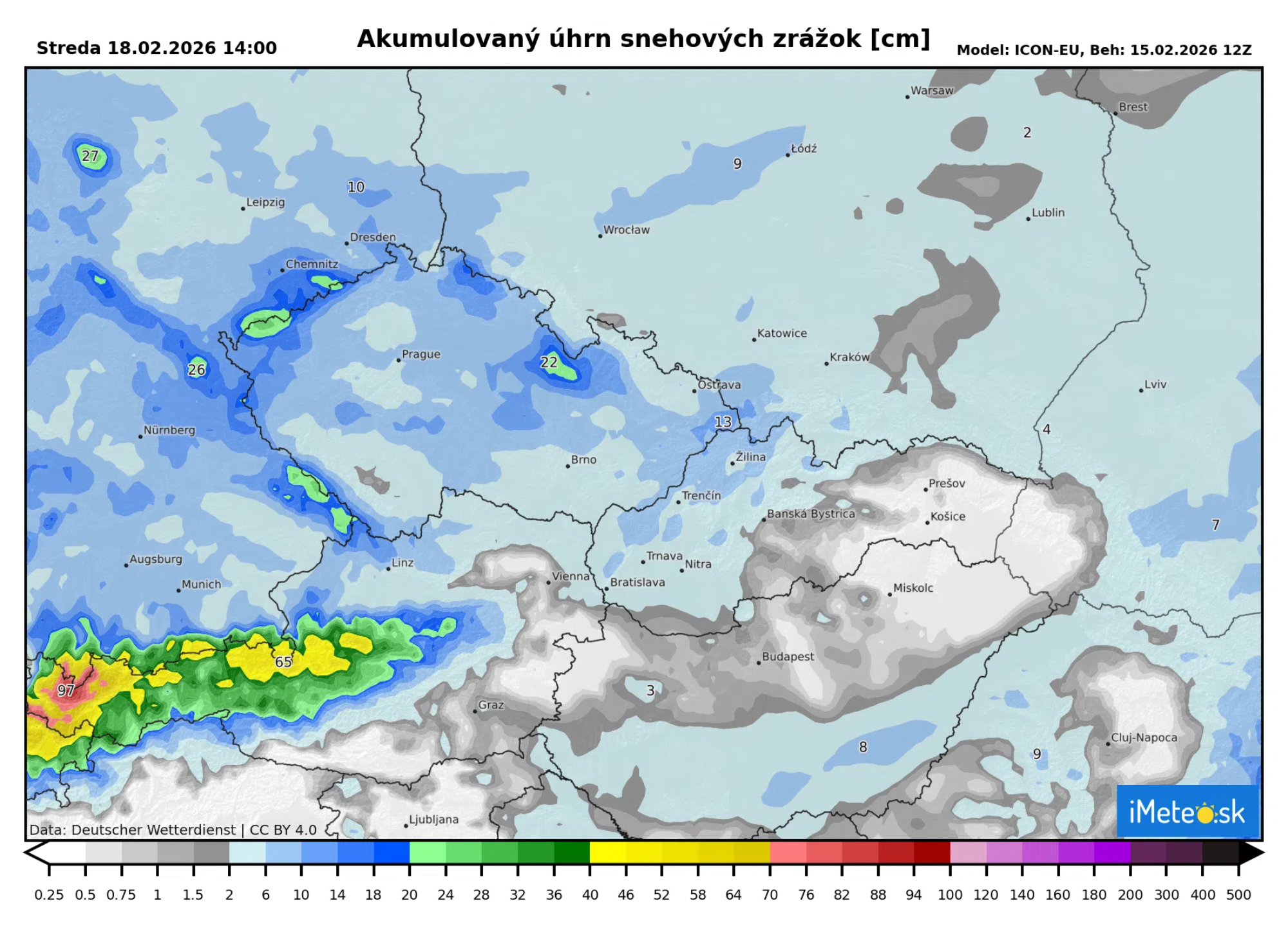 Najviac snehu sa očakáva od dnes do utorkového poludnia. Sneh pokryje veľkú časť Nemecka, Česka, Poľska a Rakúska. V nižších polohách sa vytvorí snehová pokrývka od 1 do 5 cm, v horských oblastiach okolo 10 cm.