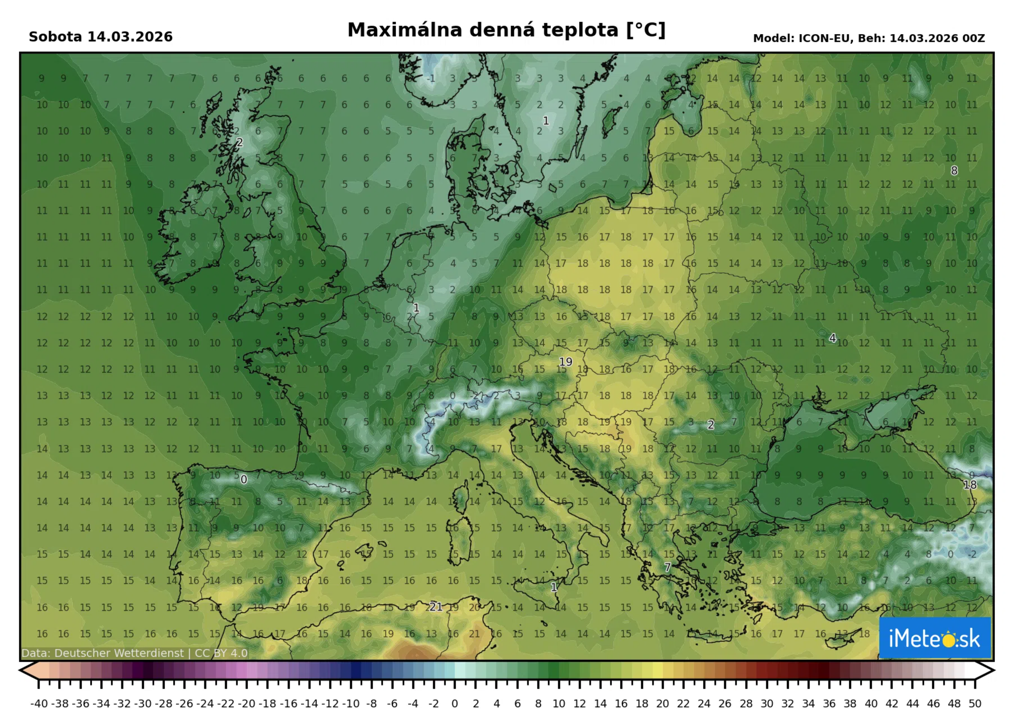 Už dnešná sobota bude v mnohých štátoch Európy veľmi chladná, čo dobre ilustruje mapa očakávaných maximálnych teplôt počas dnešného dňa. Zatiaľ čo v našom regióne nás ešte čakajú teploty od +15 do +20 °C, v západnej Európe bude dnes len okolo +10 °C a v Nemecku, najmä na západe, miestami sotva do +5 °C.