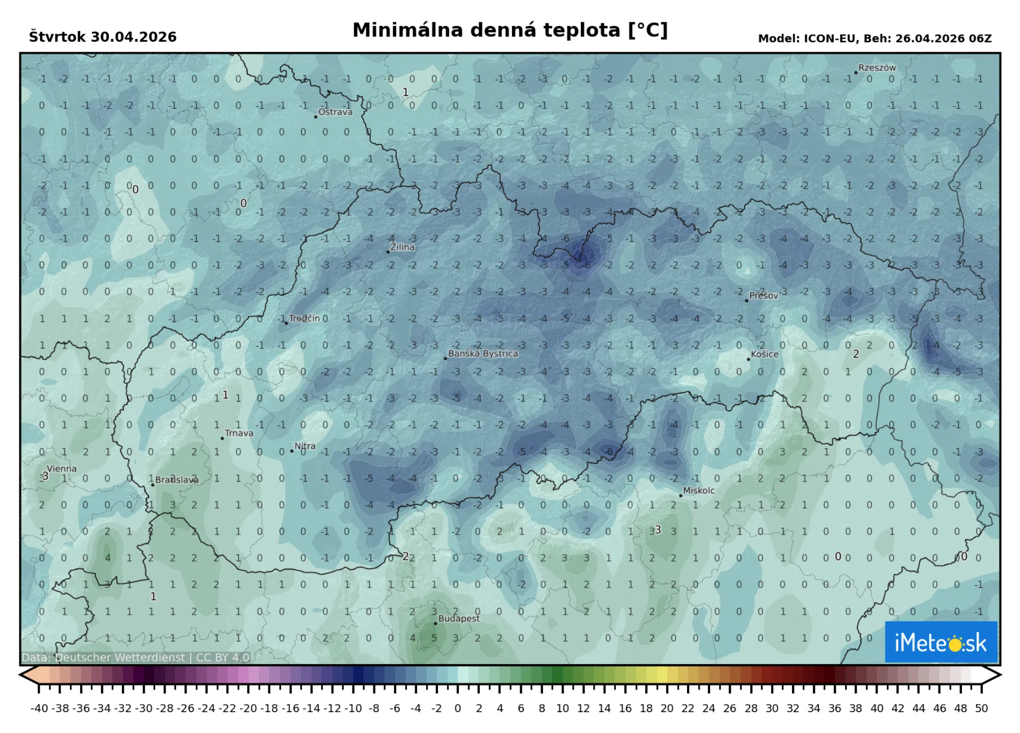 Nebezpečné mrazy by tak mohli zasiahnuť celé územie Slovenska, čo naznačuje aj aktuálna mapa teplôt v noci zo stredy na štvrtok.