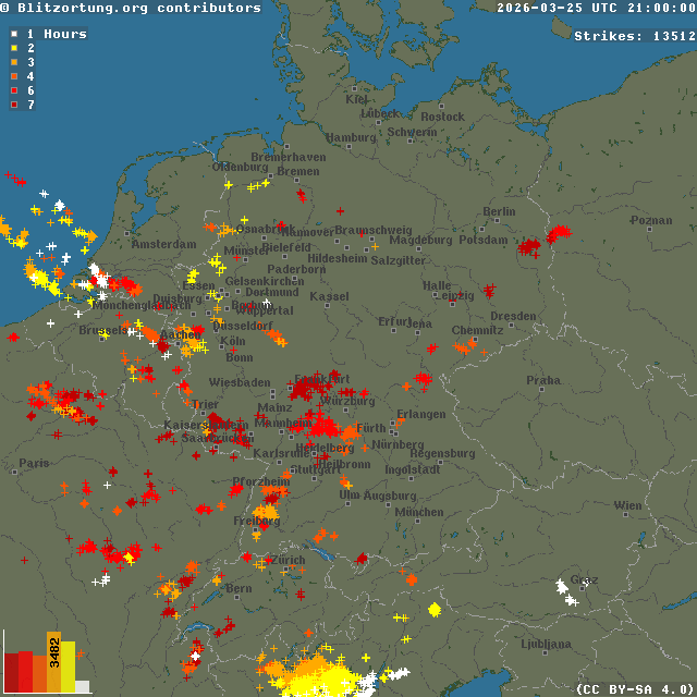 V popoludňajších hodinách dochádzalo k výraznej búrkovej činnosti nad Nemeckom a východným Francúzskom. V týchto chvíľach sa silné búrky vyskytujú na severe Talianska, ale aj v okolí rakúskeho Grazu.