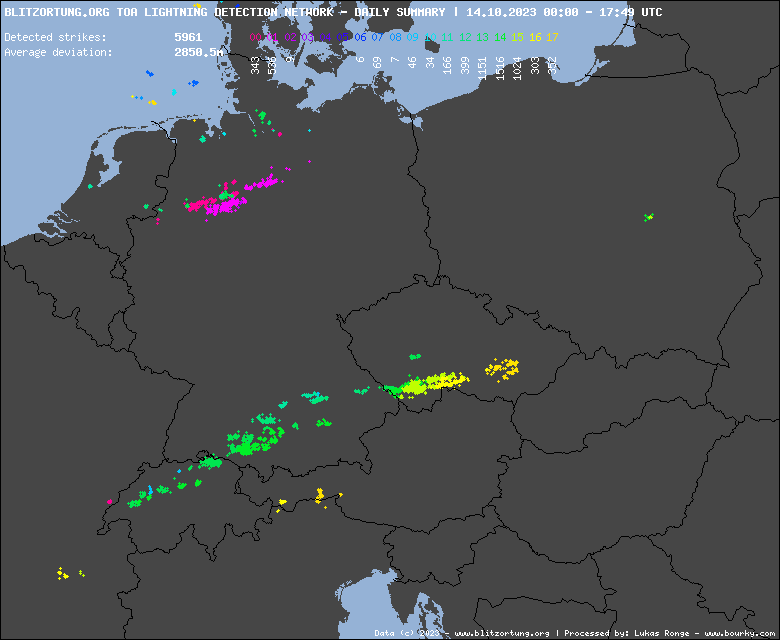 Celý front sa aktuálne tiahne naprieč Poľskom, cez Moravu, Rakúsko až nad Alpy. Najbúrlivejšie je dnes na juhu Nemecka, no aktuálne na Morave. Detekcia bleskov eviduje už niekoľko tisíc bleskových výbojov.