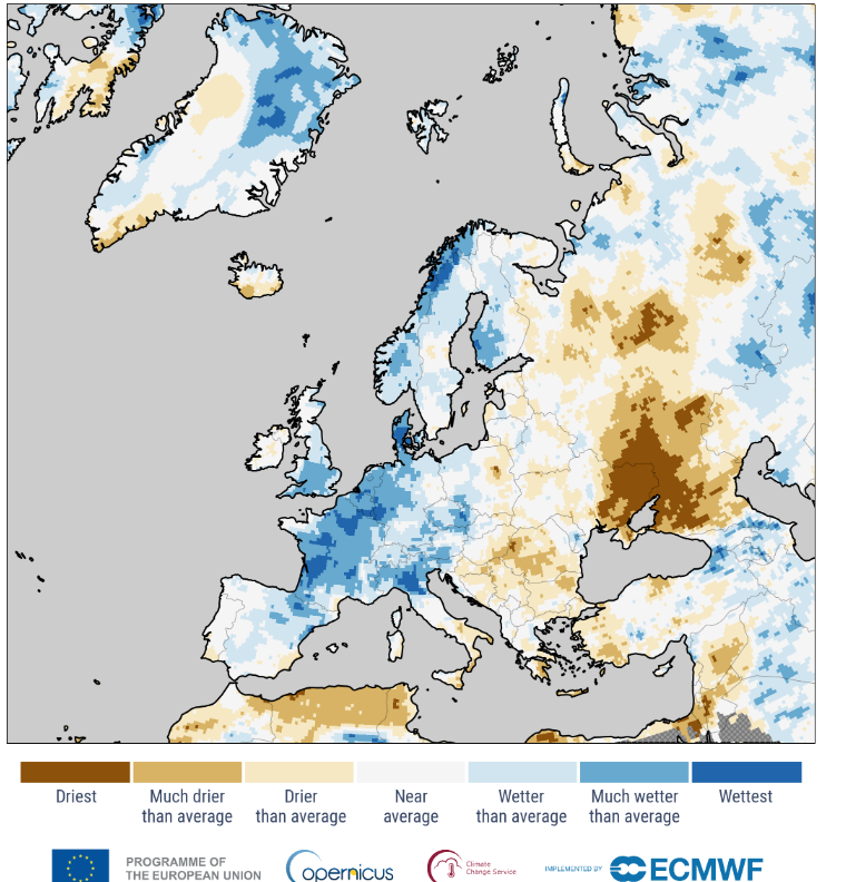 Západnú Európu zasiahli jedny z najsilnejších zrážok od roku 1950. Takmer tretina európskych riek prekročila „vysokú“ a 12 % „silnú“ prahovú hodnotu.