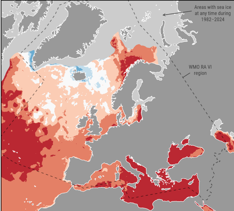 Zvýšila sa aj teplota mora, minulý rok bola najvyššia v histórii kontinentu, v priemere o 0,7 °C nad priemerom a v Stredozemnom mori dokonca o 1,2 °C nad priemerom.