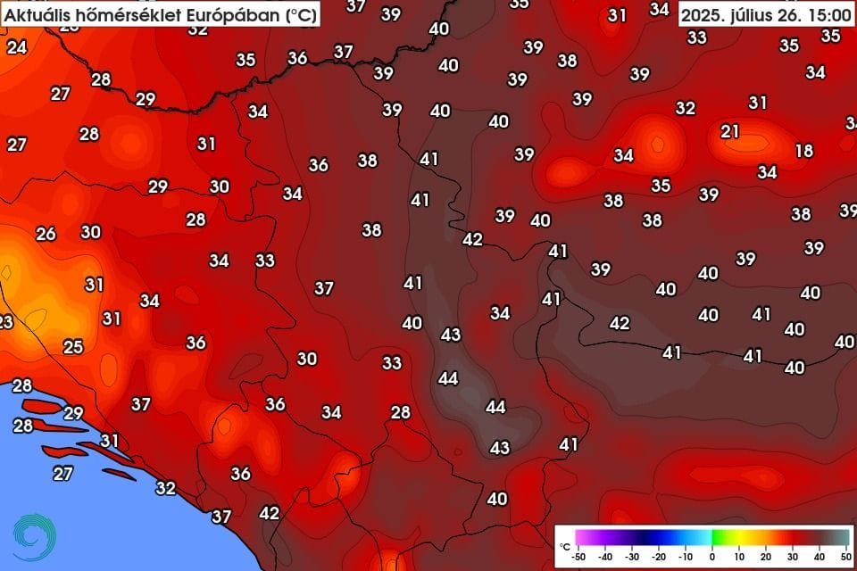 Situácia je ešte dramatickejšia južnejšie od maďarských hraníc. V Srbsku a Rumunsku sa extrémne horúci vzduch udržal vo väčšom rozsahu a dlhšie ako v Maďarsku.