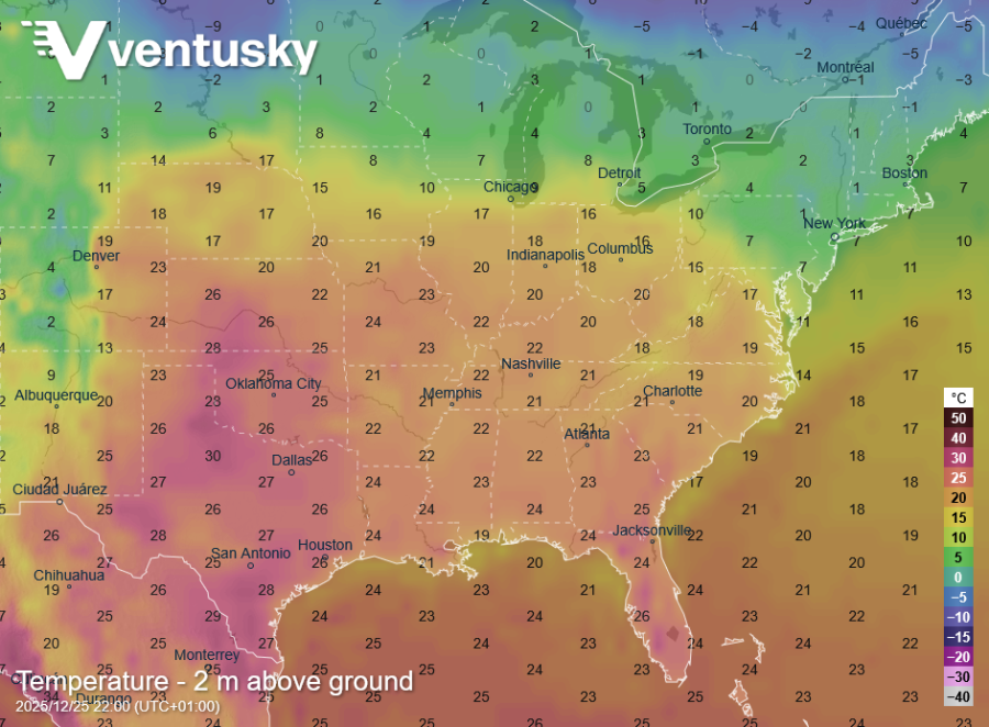 Veľmi teplo bude aj vo vnútrozemí USA. Od Kansasu cez Illinois až po Tennessee sa predpokladajú maximá okolo +24 až +26 °C. Dokonca aj severnejšie oblasti, ako Nebraska či Južná Dakota, môžu zaznamenať teploty blízke +18 až +20 °C, čo je na Vianoce mimoriadne nezvyčajné.